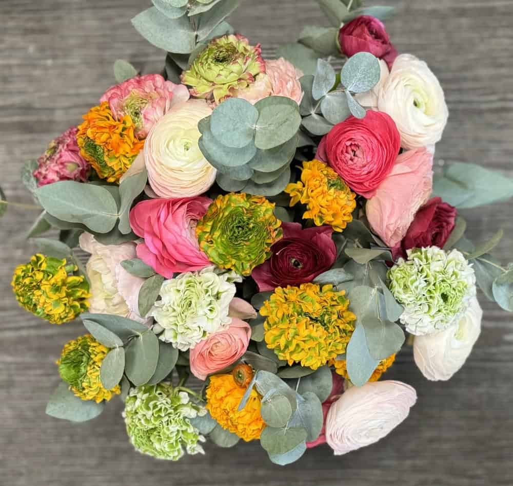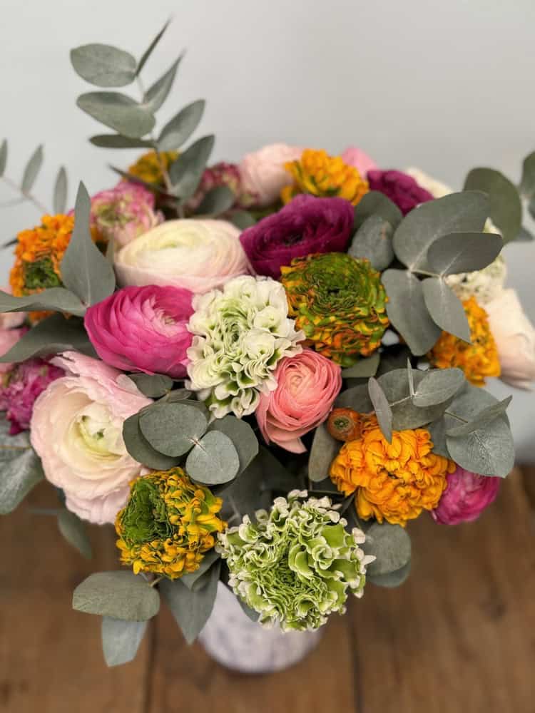 Le bouquet coloré de saison Arc-en-ciel floral est une création joyeuse et lumineuse, imaginée pour célébrer la richesse des couleurs et la fraîcheur des fleurs du moment.